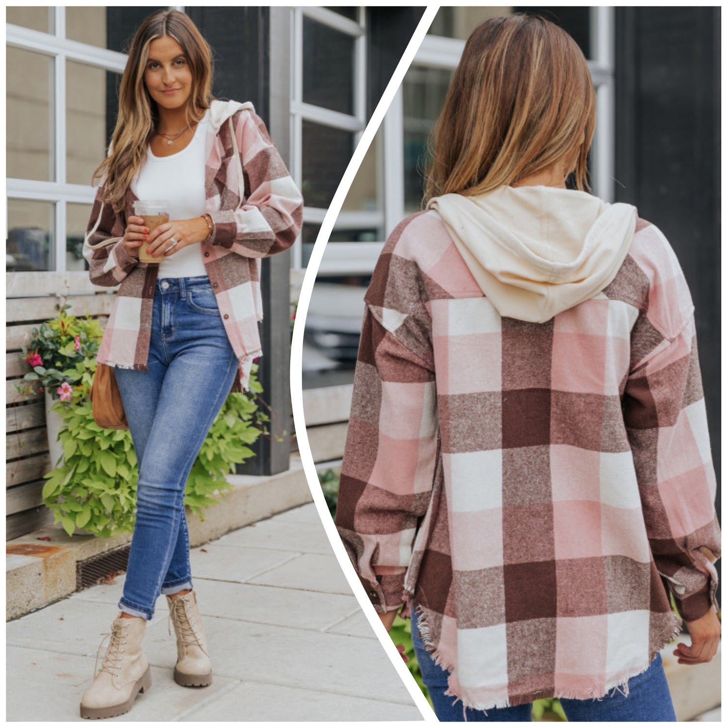 Lori Ann — Small, plaid flannel hoodie with raw hemline